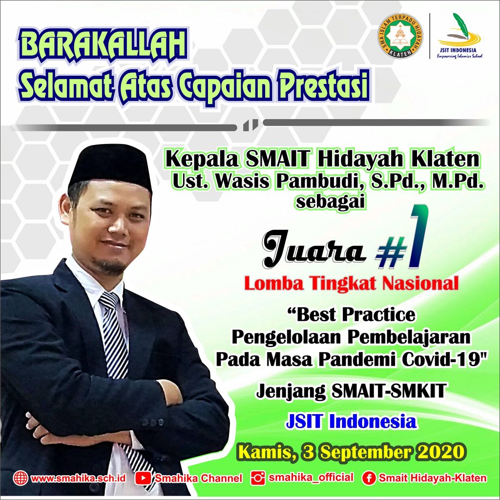 Inovasi Pengelolaan Pembelajaran Jarak Jauh (PJJ) masa pandemi Covid-19 di SMAIT Hidayah Klaten diikutkan dalam Perlombaan Best Practice Kepala Sekolah SMAIT tingkat nasional yang diselenggarakan oleh JSIT Indonesia. Perlombaan ini digelar dalam rangka Milad JSIT yang ke-17. Dilaksanakan secara daring pada Kamis, 3 September 2020 dan diikuti oleh kepala SMAIT seluruh Indonesia. Kepala Sekolah SMAIT Hidayah Klaten, Wasis Pambudi, S.Pd., M.Pd. mantap tampil membawakan presentasi tentang inovasi pengelolaan PJJ yang memang sedang berlangsung di SMAIT Hidayah Klaten, dengan judul: “Pembelajaran “Dar-Ling” (Dalam Jaringan-Luar Jaringan) Sebagai Formulasi Solusi Menghadapi Dua Ancaman Pendidikan Pada Masa Pandemi Covid-19″.